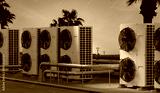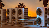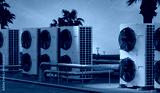 HVAC engineering operates rooftop air conditioning condenser units at sunset. Climate control systems, building cooling, commercial ventilation and energy efficiency services.