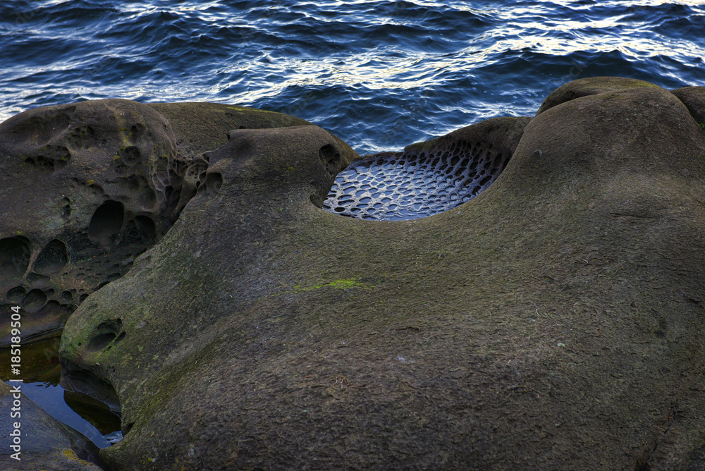 Sandstone rock formation and ocean waves at Roberts Memorial Park in Nanaimo, BC
