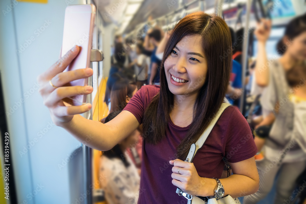 Asian woman passenger with casual suit taking selfie by the smart mobile phone in the Skytrain rails or subway for travel in the big city, lifestyle and transportation concept