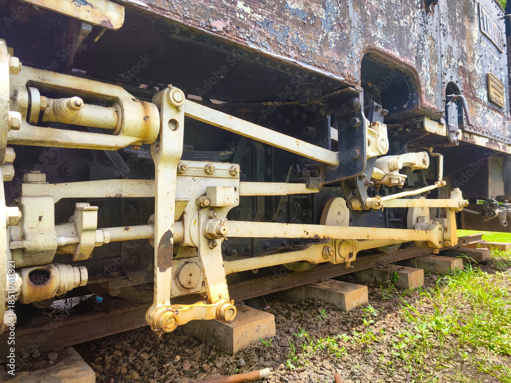 Vintage steam locomotive mechanical parts and metal linkage detail