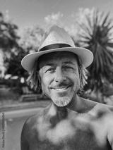 Happy blond man with straw hat and a stubble beard by a pool in a sunny summer garden.