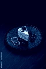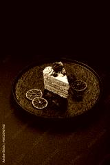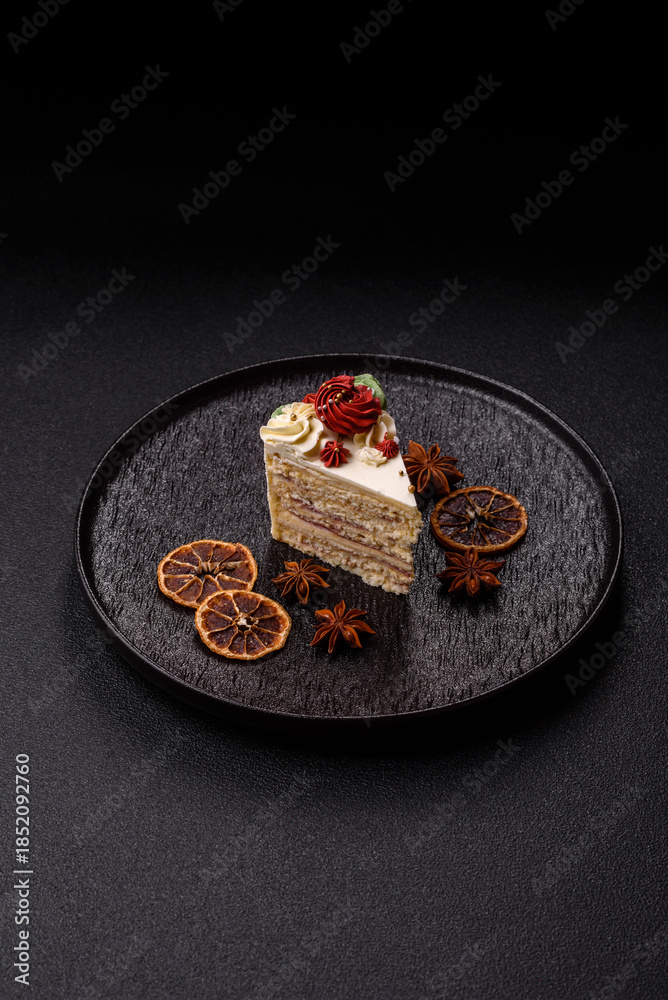 A slice of sweet layered cake with white cream for a birthday or holiday. A slice of cake