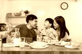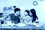 happy family together. Asian parent eating breakfast with little son in the kitchen.