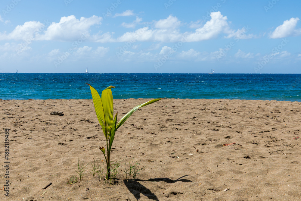 Young palm-tree growing on the beach beach - Martinique, French Antilles