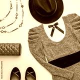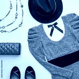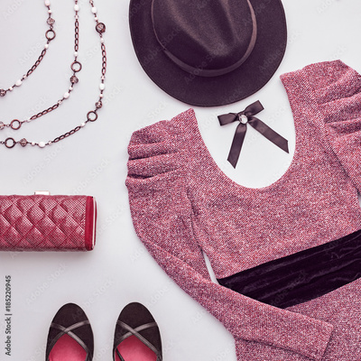 Autumn Arrives. Fall Fashion. Minimal. Woman Stylish Outfit. Design fashion. Trendy Dress, Glamor fashion Heels, Handbag Clutch. Stylish Hat. Vintage Elegant Creative. Top view