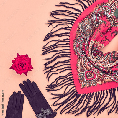 Autumn Arrives. Fall Fashion. Woman Stylish Outfit. Design fashion. Trendy Stylish Scarf, Gloves, Rose.Vintage Elegant Creative Minimal. Top view