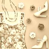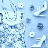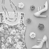 Fashion. Minimal. Woman Stylish Colorful Summer Outfit. Design fashion. Trendy Stylish Dress, Glamor fashion Heels. Rose. Vintage. Elegant Creative. Top view