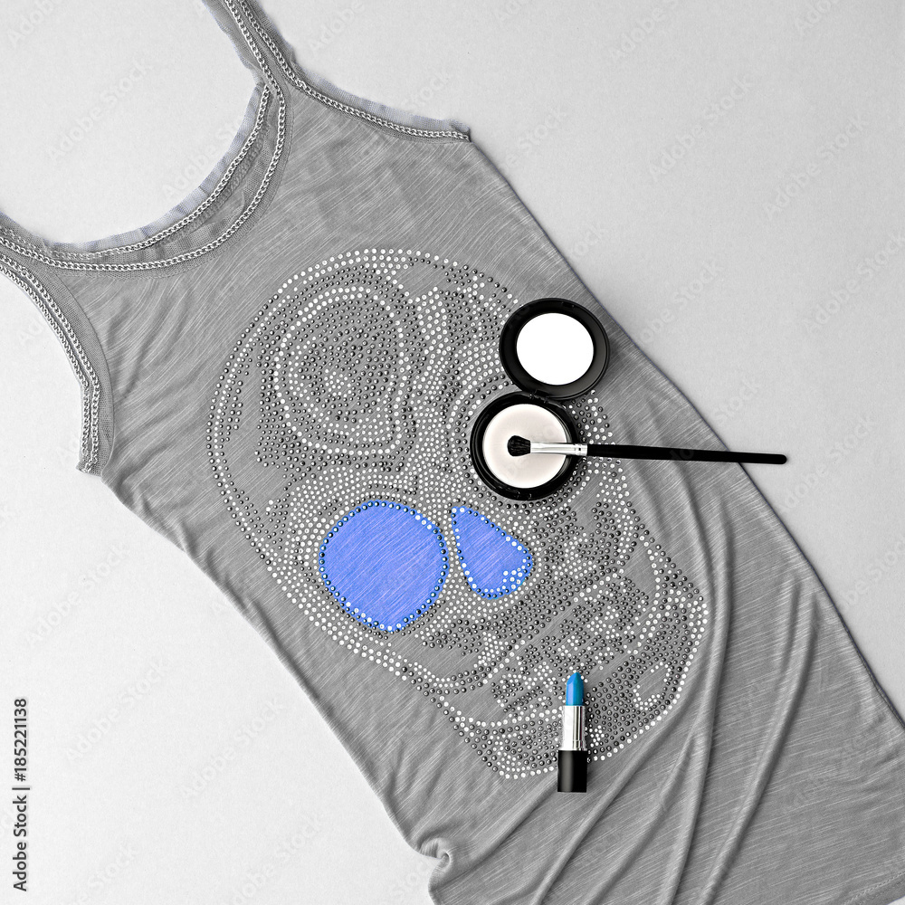 Fashion Design Outfit. Essentials fashion Cosmetic Makeup. Woman Clothes Accessories Set. Stylish Trendy Dress, Glamor fashion Lady. Lipstick. Top view. Creative. Minimal