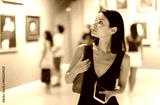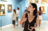 Woman of European appearance visits an exhibition of paintings in a museum, she uses an audio guide and studies historical information about artists