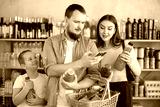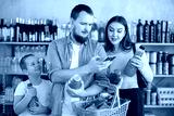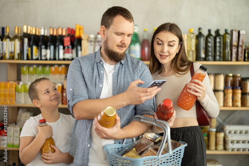 Couple young man and woman buyers with boy scanning qr code for juices in bottle in grocery store