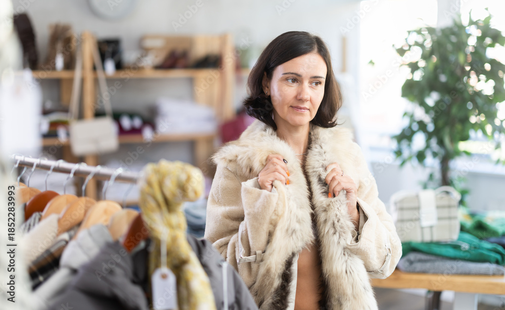 Adult female shopper tries on winter fur coat in clothing store