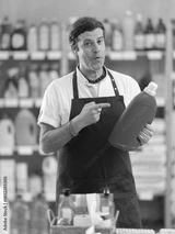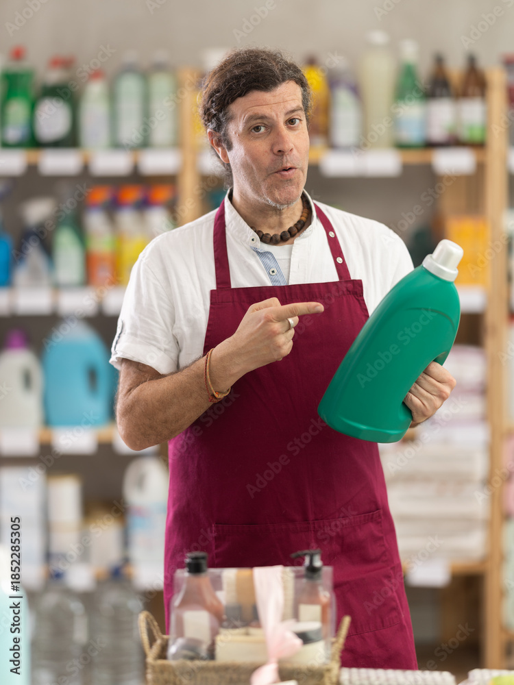 Adult man seller offers laundry detergent in household chemicals store