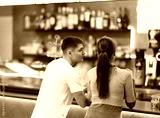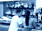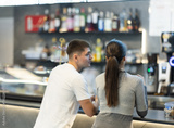 Couple is having nice conversation, spending time in cafe, meeting without ties. Business meeting, friendly conversation, date, relaxed atmosphere and chatter. Couple at bar counter, back view.