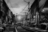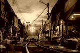 A train approaches the bustling Maeklong Railway Market as vendors prepare their colorful stalls. The pink hues of sunset enhance the lively atmosphere, Fresh Market on the Railroad Track, Bangkok