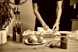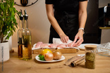 Female hands drying raw chicken breasts with paper towels in home kitchen. Woman in black apron preparing meat fillets with fresh vegetables and ingredients. Process of cooking and food preparation