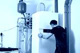 Technician installing indoor heat pump system with pipes and expansion tank. Man adjusting control panel on heat pump. Concept of home heating installation, energy efficiency and HVAC maintenance