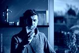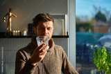Adult man drinking fresh clean water from glass while standing in kitchen near window with sunlight. Person quenching thirst at home. Concept of hydration and healthy lifestyle