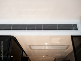 Wall-mounted air vent system inside a white clean modern hotel room, showing HVAC ductwork for indoor air circulation, cooling system design, and energy-efficient building ventilation.