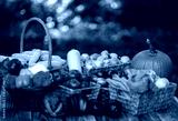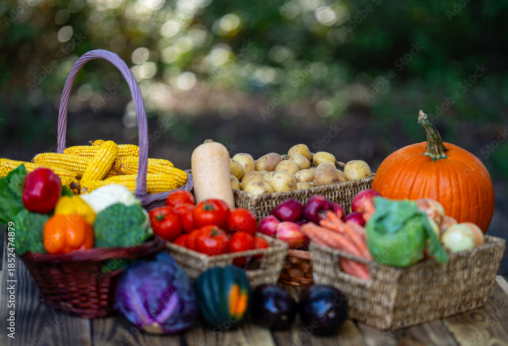 Harvest vegetables and fruits. Autumn harvest background. Basket full of fresh apples, potatoes, and peppers from a harvest. Organic harvest broccoli corn cucumbers ready for market.