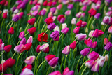 Multicolored blossoms spring. Fresh tulip field in natural spring light. Springs multicolored flowers. Natural tulip landscape with spring colors. Blooming tulip field in spring.