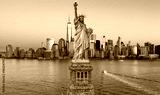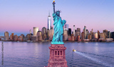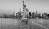 New York skyline at Statue of Liberty. American Independence Day. NYC with World Trade Center and Statue of Liberty. Manhattan skyline Freedom Tower and Liberty Statue.