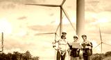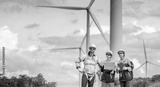 Team of Engineers Planning Project for Renewable Energy Professional Team Inspecting Wind Turbines for Clean Energy Generation Collaboration : Engineers with Blueprint at Wind Farm.