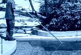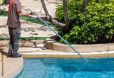 A man is standing by a pool with a pool cleaning tool
