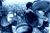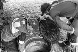 Male workers in overalls peer into an open manhole, checking utilities. Cleaning septic tanks and cesspools