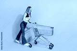Cheerful young woman with a shopping cart against a vibrant yellow background, showcasing casual fashion and energetic lifestyle
