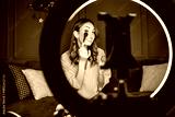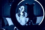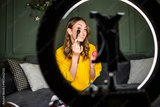 Beauty vlogger filming a makeup tutorial at home. She is sitting on sofa and vlogging with ring light and smartphone.
