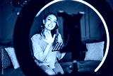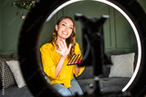 Vlogging makeup session at home. Woman is filming makeup process with ring light and smartphone.