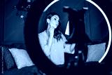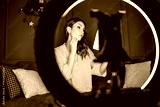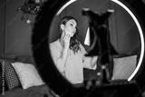 Vlogging makeup session at home. Woman is filming makeup process with ring light and smartphone. She is removing makeup.