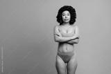 Bright confident young woman in pink bikini stands with arms crossed against a grey studio background