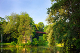 Suspended footbridge over the lake in the Buttes-Chaumont park 19th arrondissement of Paris city