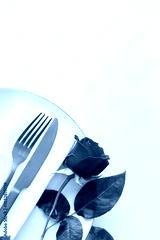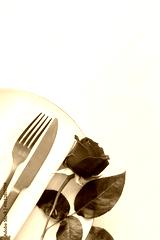 Place setting for a romantic dinner, with gold cutlery and a single long-stemmed red rose resting on a plate and napkin. The shot has a lot of white space for text or design.