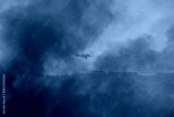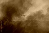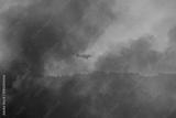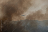 Light aircraft working in wildfire suppression flies through a cloud of smoke during a forest fire in Ourense