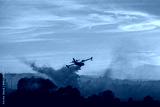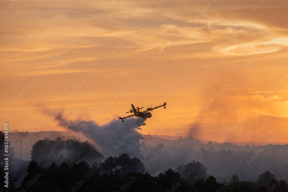 Amphibious aircraft dropping water onto a wildfire in a pine forest at dusk. Ourense, Spain