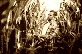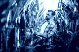 Farmer examining corn crop in cultivated field at sunset