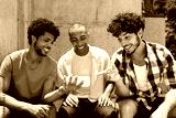 Groupon african american an caucasian hipster man watching sports game live on phone
