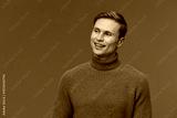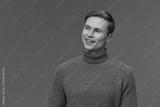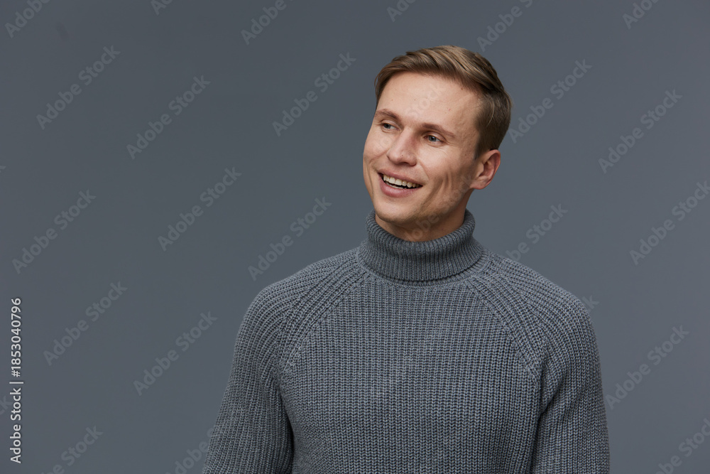 Smiling young man with short brown hair wearing a cozy gray turtleneck sweater, looking to the side with a happy expression, isolated on a plain gray background, suitable for lifestyle and fashion