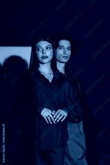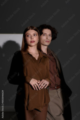 Stylish young couple showcases modern fashion in dark grey studio backdrop