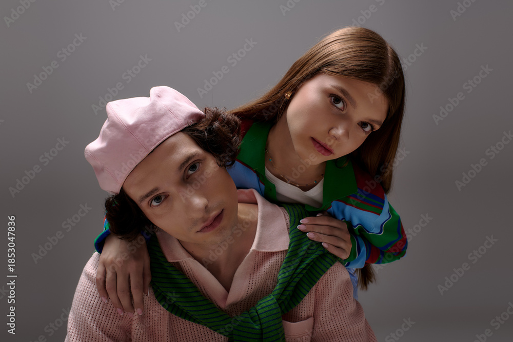 Stylish young couple showcasing modern fashion trends in a cozy studio setting