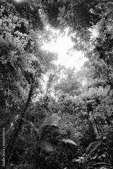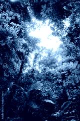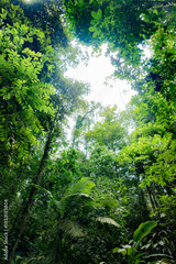 Lush green foliage forming natural frame around bright sky in colombian rainforest