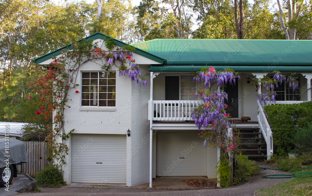 Suburban house near Brisbane Australia with wisteria growing over the stairs and porch and tall gum trees behind