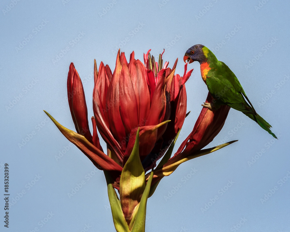 Australian Rainbow Lorikeet (Trichoglossus moluccanus) feeding on a red Gymea lily (Doryanthes excelsa)