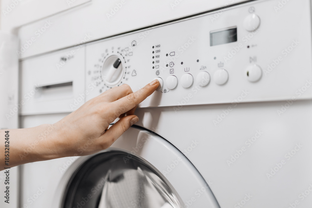Hand of a person adjusting settings on a modern washing machine, showcasing the control panel with various buttons and dials, emphasizing user interaction with home appliance technology