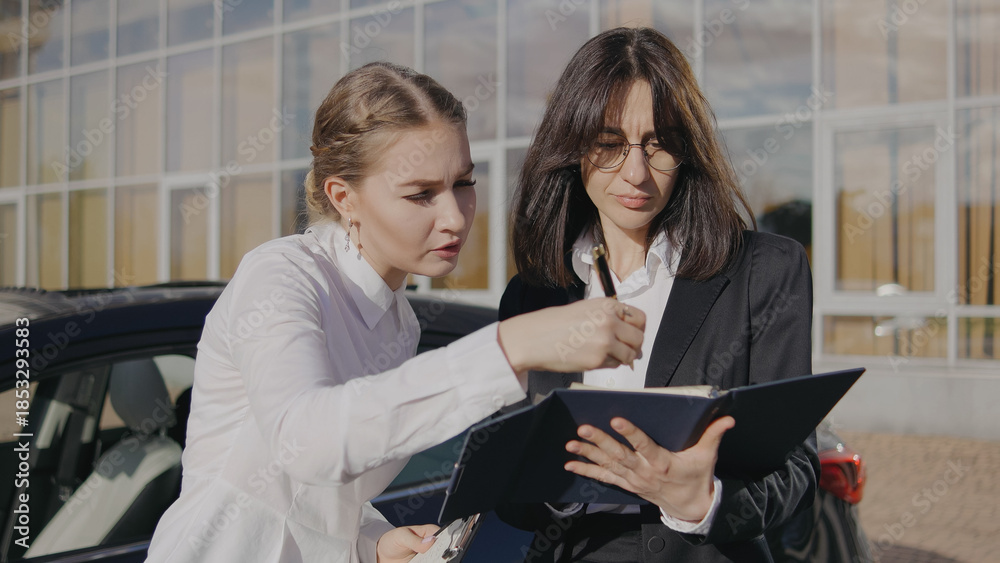 Two women discuss details while standing near a car in front of a large glass building during the day