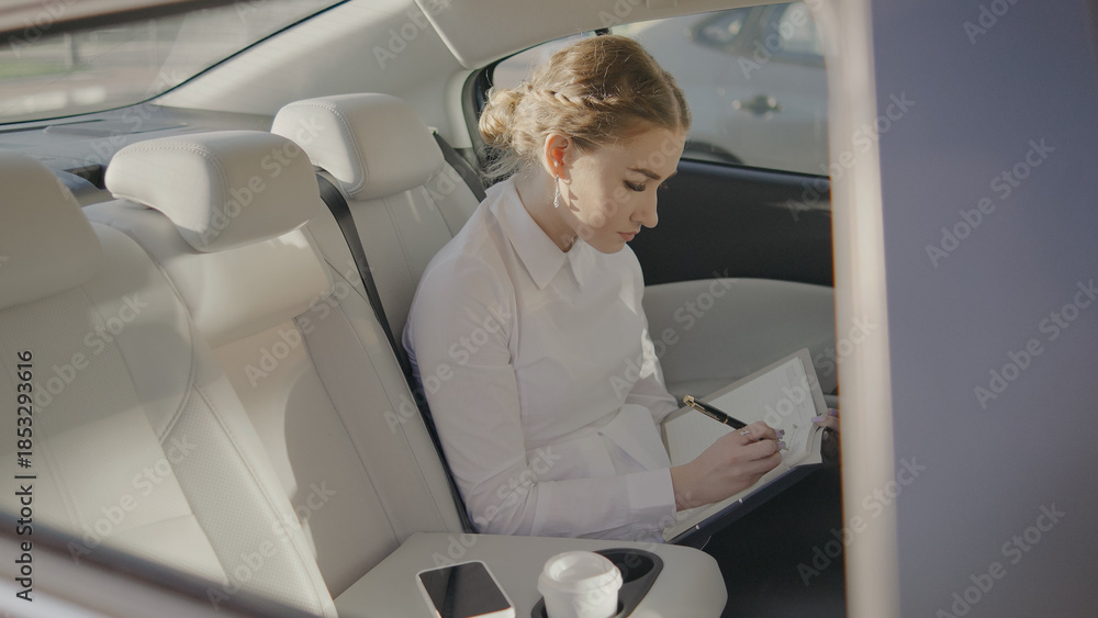 Woman writing in notebook while seated in the back of a car during daylight in a city setting