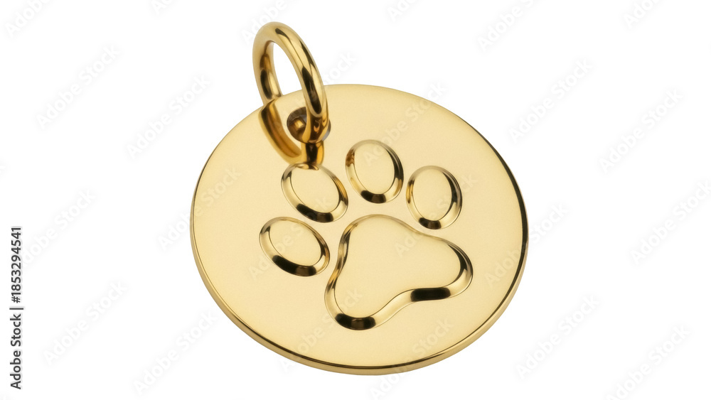 Golden dog tag with paw print isolated PNG on transparent background, pet accessory for identification and animal lovers