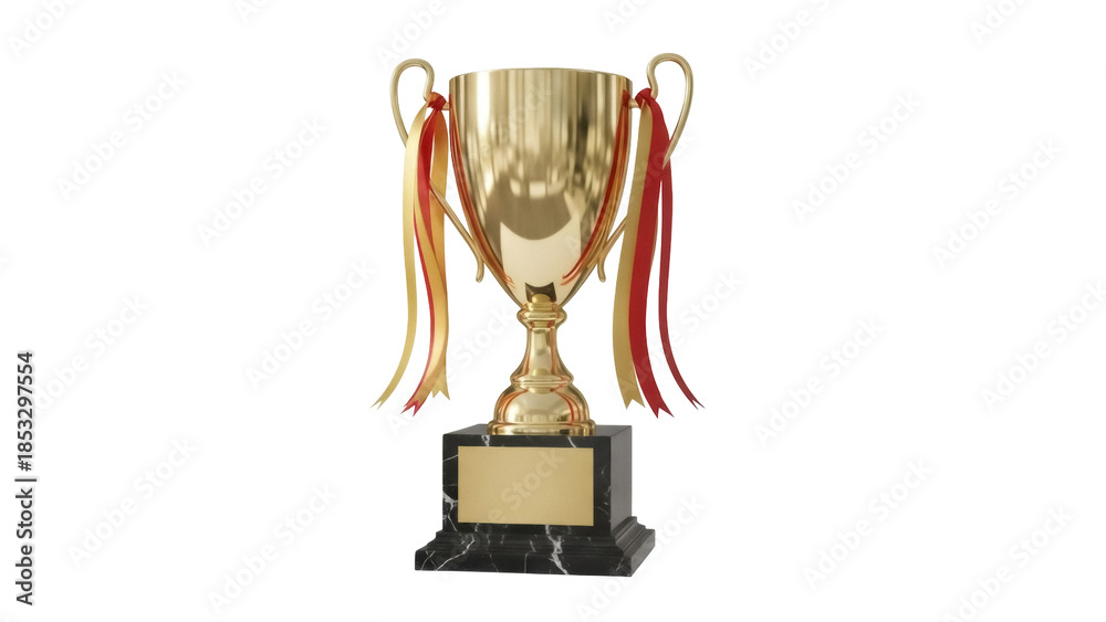 Golden trophy cup with red and gold ribbons isolated PNG, award prize for winning a competition or championship on transparent background
